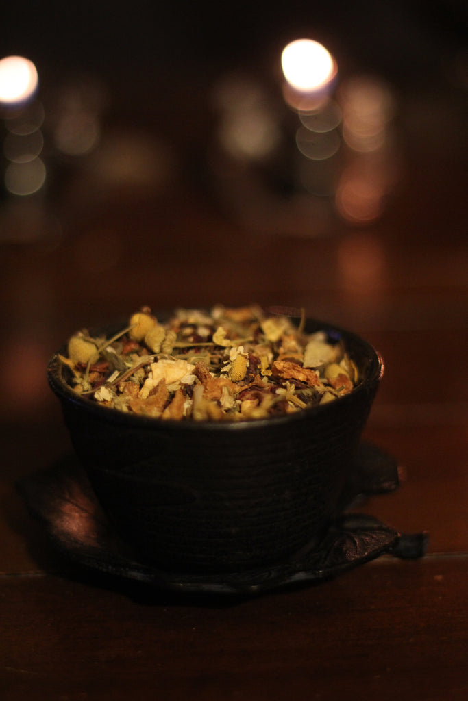 "This tea is a sister to the Peaceful Home blend; there's no missing that chamomile note! But the cocoa nibs and chocolate mint give it a touch more mellowness. Their contribution is subtle - don't expect to taste a peppermint patty. Instead they add an intriguing layer of depth to the overall flavor, not quite inducing sleepiness, but definitely conducive to a more relaxed frame of mind. It's quite a lovely tea for ritual work." -Rommy D.
